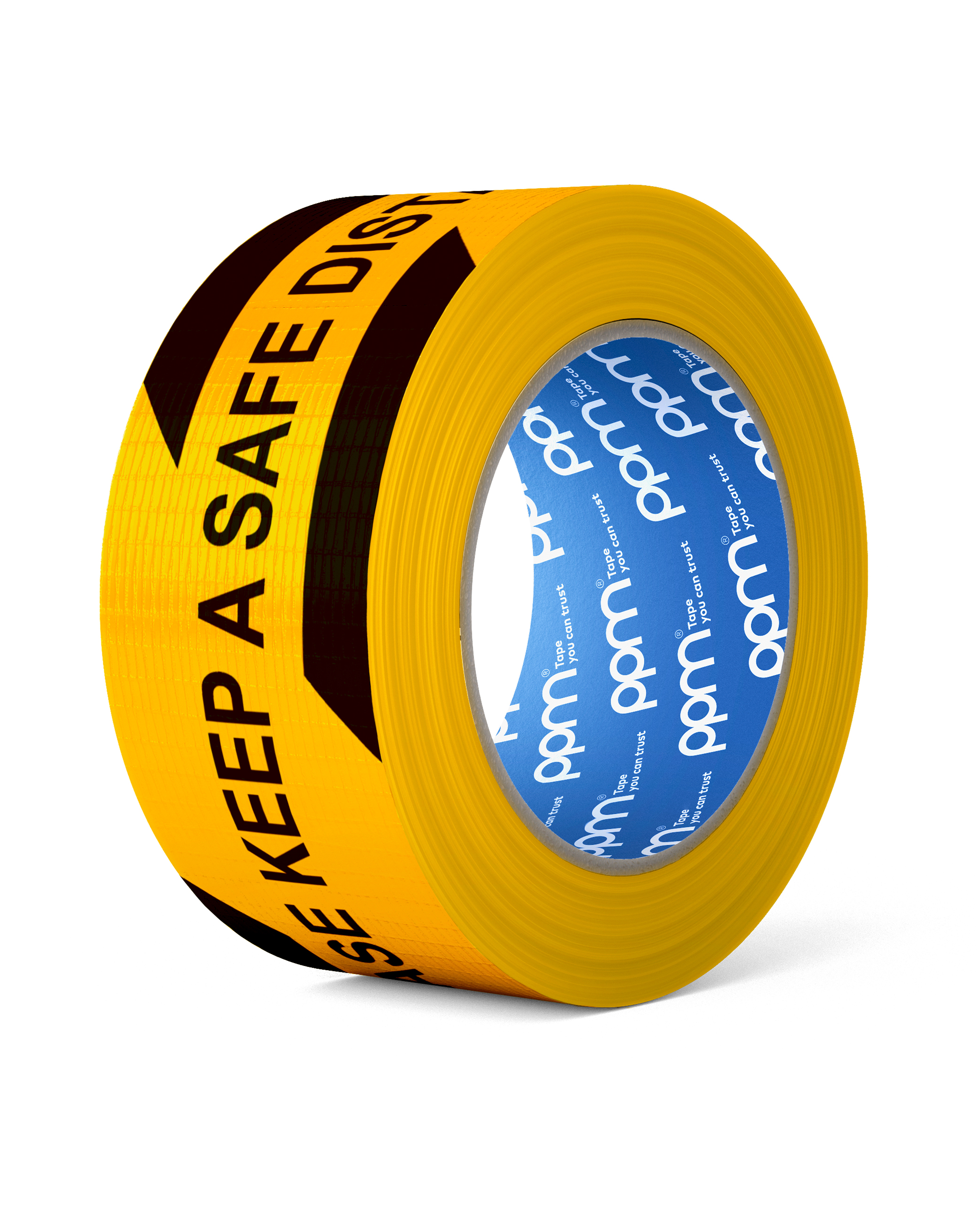 This security tape is printed with the words “PLEASE KEEP A SAFE DISTANCE” in bolded capital letters directly on the carrier to help increase social distancing awareness. According to your needs, the message on the tape can be custom printed in four different languages: English, Italian, German and Spanish. This tough chevron striped printed security tape is characterized by a great resistance to abrasion and high adhesion.